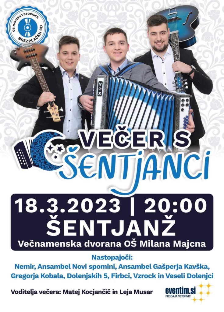 Tudi letos so Šentjanci povabili v goste kopico izjemnih glasbenih prijateljev, ki so garancija za odlično zabavo. Tako bo 18.3.2023 v Šentjanžu mogoče prisluhniti smetani trenutno najbolj popularnih narodnozabavnih zasedb. Na odru se jim bodo pridružili: Vzrock, Firbci, Novi spomini, Nemir, Veseli Dolenjci, Ansambel Gregorja Kobala, Dolenjskih 5 in Ansambel Gašperja Kavška….